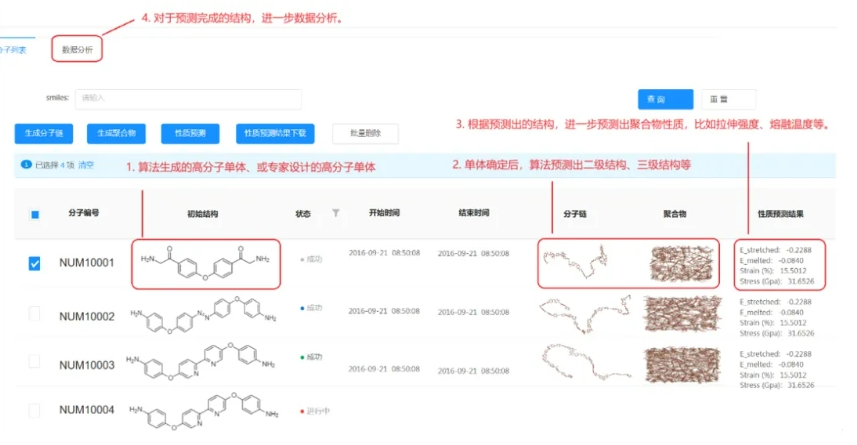 目前常規的高分子材料方法依賴于實驗試錯法,即使通過將量化計算方法、計算機建模和人工智能結合起來,開發了高分子材料研發平臺,覆蓋單體分子篩選,聚合后分子量預測,力學性能預測和工藝優化等環節,填補了高分子研發工具的空白。