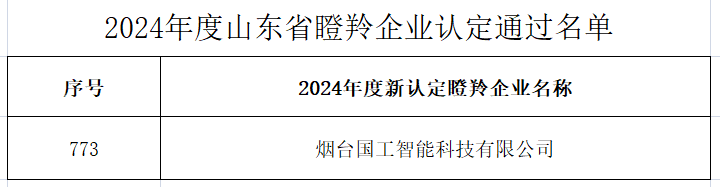 2024年12月16日,煙臺國工智能科技有限公司獲評2024年度新認定的山東省瞪羚企業。