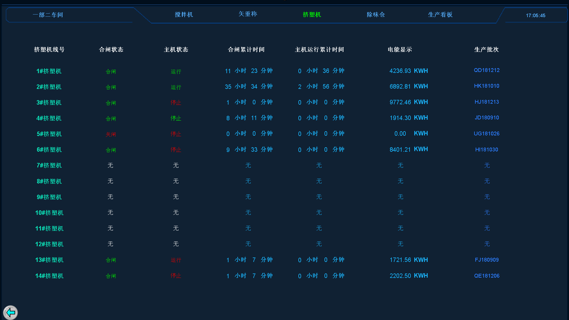 從生產(chǎn)的數(shù)據(jù)的角度主要是進(jìn)行的數(shù)據(jù)采集、整理和分析。形成報(bào)表等相應(yīng)的表單,通過對(duì)每一個(gè)生產(chǎn)線數(shù)據(jù)的分析,實(shí)現(xiàn)對(duì)生產(chǎn)組織,工藝指標(biāo)的嚴(yán)格控制,保證產(chǎn)品的質(zhì)量和降低生產(chǎn)能耗的生產(chǎn)目標(biāo)。 從管理角度主要指執(zhí)行下達(dá)的工單任務(wù)單能得到,準(zhǔn)確,無誤的執(zhí)行,調(diào)度生產(chǎn)過程所需要的各種資源,協(xié)調(diào)生產(chǎn)的相關(guān)運(yùn)作環(huán)節(jié),為企業(yè)管理人員提供生產(chǎn)過程的監(jiān)督保證生產(chǎn)的平穩(wěn)、持續(xù)進(jìn)行。 通過對(duì)高速攪拌機(jī)、矢重秤、螺桿擠塑機(jī)、均化倉(cāng)、自動(dòng)換網(wǎng)機(jī)的生產(chǎn)過程數(shù)據(jù)來判斷生產(chǎn)質(zhì)量和設(shè)備狀況等信息;