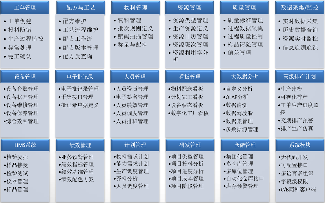國工智能MES系統主要包括以下模塊,工單管理模塊、研發管理模塊、物料管理模塊、資源管理模塊、質量管理模塊、設備管理模塊、電子批記錄模塊、看板管理模塊、大數據分析模塊、績效管理模塊。