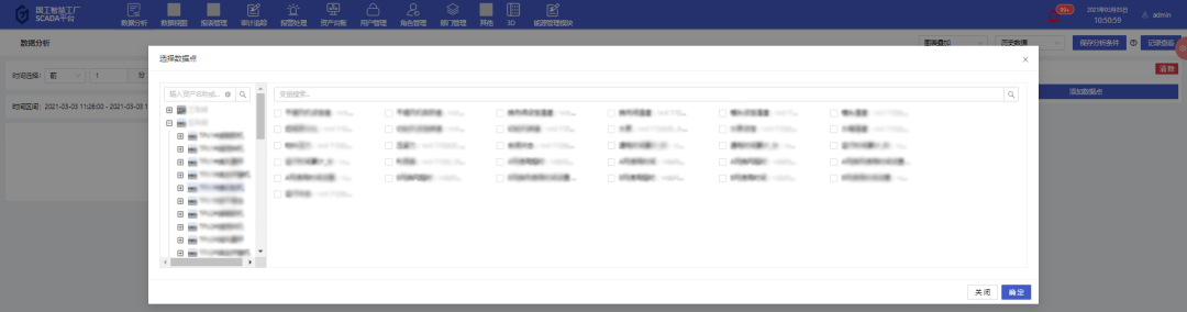 以某一特定設(shè)備為例,使用平臺數(shù)據(jù)分析功能,將平臺中的有效數(shù)據(jù)進行分析。根據(jù)用戶的需要,對一段時間內(nèi)的歷史數(shù)據(jù)或?qū)崟r數(shù)據(jù)按照一定的統(tǒng)計頻率進行多個維度的數(shù)據(jù)分析,統(tǒng)計頻率包含不限、10秒、30秒、5分鐘、10分鐘、30分鐘、1小時,通過添加變量操作,在彈出的變量選擇彈窗中可多選數(shù)據(jù)點信息,可以通過資產(chǎn)樹選中資產(chǎn)來選擇數(shù)據(jù)信息或者直接通過模糊搜索查找數(shù)據(jù)點。數(shù)據(jù)分析得到的圖表顯示形式包括折線圖以及表格形式。多個數(shù)據(jù)點信息圖表的展示形式包括平鋪、疊加、標簽顯示以及合并表格顯示,根據(jù)不同的需求選擇對應(yīng)的展示形式,靈活性高。數(shù)據(jù)分析幫助用戶分析用戶想要分析的內(nèi)容,如數(shù)據(jù)走向、問題等,從而幫助用戶解決問題。