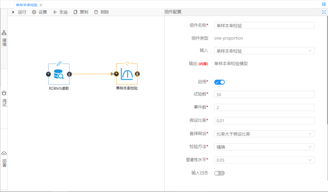 圖2 單樣本率檢驗分析組件及參數配置