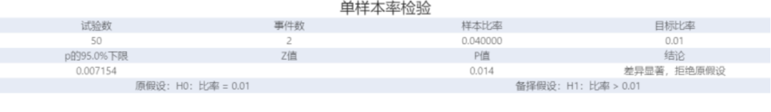 使用集成好算法的單樣本率檢驗分析組件(One-proportion)進行數據的單比率分析處理,根據單樣本率假設檢驗的檢驗流程:首先確定檢驗的問題為“手套的實際生產寬度是否符合外觀標準”。所以我們將零假設H0設定為手套的實際生產寬度不符合外觀標準,那么備擇假設H1即可設定為手套的實際生產寬度符合外觀標準。我們可以設想,若手套的實際生產寬度≥80mm,則在抽取的50只手套中應只有少量幾只手套的寬度小于80mm,如果出現大量手套寬度小于80mm,則我們有理由懷疑手套的實際生產寬度小于80mm。所以,我們假設在抽取的50只手套中僅有2 只不合格的概率為0.01,即設定實驗數為50,不合格事件發生數量為2,目標概率為0.01,如圖2所示。當然,即使該企業使用當前生產參數生產的手套寬度≥80mm,因為偶然因素導致我們剛好抽取了很多寬度小于80mm的手套的情況也不可避免,此時按照我們的邏輯要拒絕零假設,也就是我們判斷錯了,我們可以將顯著性水平(判斷錯誤的概率)設定為0.05,如圖2所示。