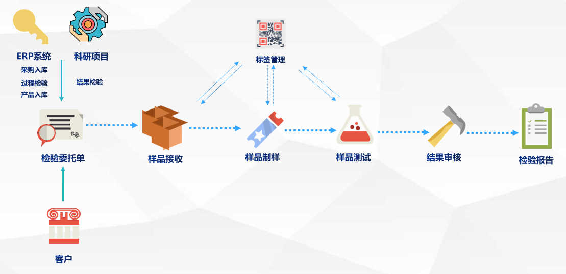 檢驗業(yè)務管理流程是實驗室的標準化流程,適合多數(shù)實驗室使用。樣品接收、樣品制樣、樣品檢測通過掃描標簽跟檢驗委托單關聯(lián)并獲取信息,使得業(yè)務數(shù)據(jù)可追溯并減少人工錄入過程,提高工作效率和避免失誤。