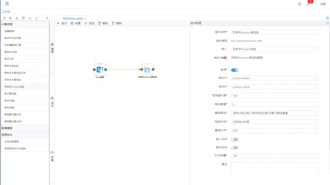 再通過拖拽的方式將雙樣本Poisson率檢驗分析組件與Excel讀取鏈接到一起。使用集成好算法的雙樣本Poisson分析組件進行數據的Poisson分析處理,對組件參數進行設置,因素字段配置為factor,結果值配置為檢驗結果result,顯著性水平設置為0.05,單擊運行,從調試面板中查看分析結果。