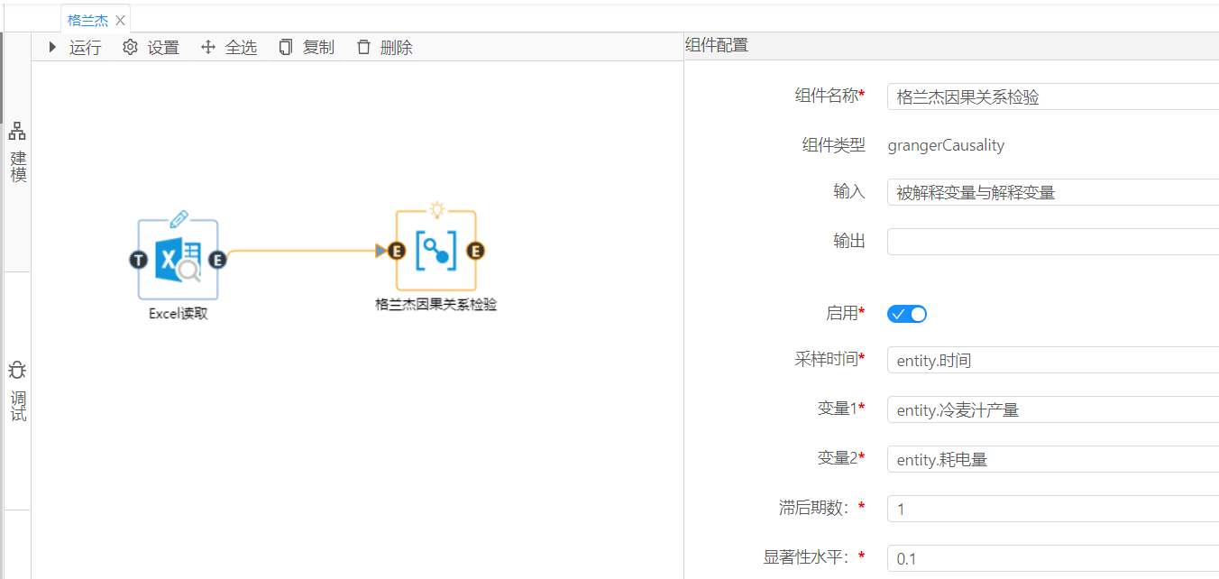 首先,從數(shù)據(jù)大腦中的組件面板搜索格蘭杰因果關系檢驗組件,拖到到工作面板,配置數(shù)據(jù)及組件參數(shù):滯后期數(shù)選擇1,顯著性水平選擇0.1,點擊運行。過程如圖1: