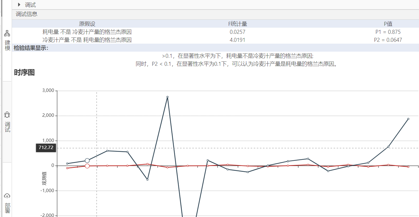 下表是某啤酒企業(yè)2005-2009年各個季度冷麥汁的產(chǎn)量和制冷耗電量的數(shù)據(jù),該時間序列數(shù)據(jù)經(jīng)過差分處理是平穩(wěn)的,符合格蘭杰因果檢驗的前提。利用AIC信息準則確定最優(yōu)階數(shù)是1,接下來將使用國工數(shù)據(jù)大腦已經(jīng)集成好的格蘭杰因果關系檢驗算法對數(shù)據(jù)進行雙向因果關系檢驗,即檢驗冷麥汁的產(chǎn)量是否為制冷耗電量的格蘭杰原因及制冷耗電量是否為冷麥汁產(chǎn)量的格蘭杰原因。