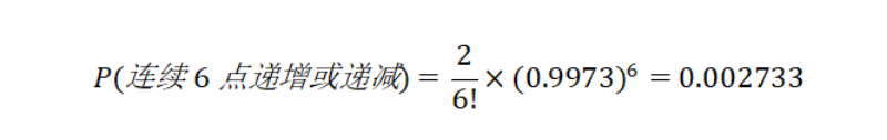 首先,當過程處于統計控制狀態,6個連續的點不越界的概率很顯然是 () ,但是如果連續遞增或者遞減,則相當于一個排列組合的過程(遞增排列或遞減排列),因此,其概率僅有: