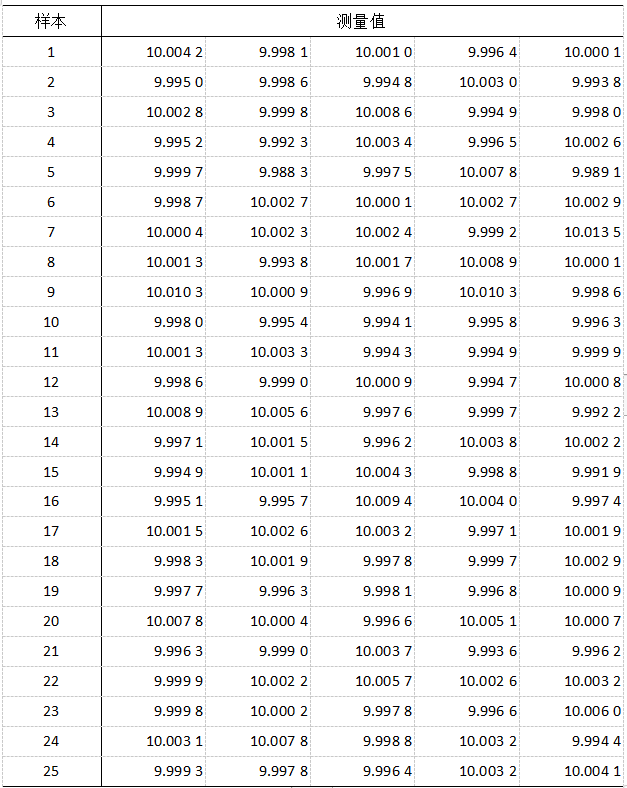 在油漆制造過程中,用相同的壓注嘴連續地向1加侖的油漆罐注入油漆。為了監測這個過程,決定在接下來的25h內每小時一次抽取5個連續的罐,測量每個罐的重量(lb),樣本數據如表2所示,需要通過合適的控制圖來判定過程是否受控。