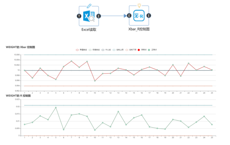 對于這個問題,由于子組容量小于9,且數據是數值型變量,最合適的控制圖方案是控制圖。將數據導入國工智能數據大腦平臺,通過控制圖分析后得到如下結果: