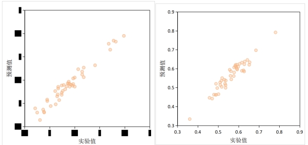 左圖為某類高分子材料斷裂伸長率預測結果(R2=0.96),右圖為斷裂強度預測結果(R2=0.90)(數據已進行脫密處理)。