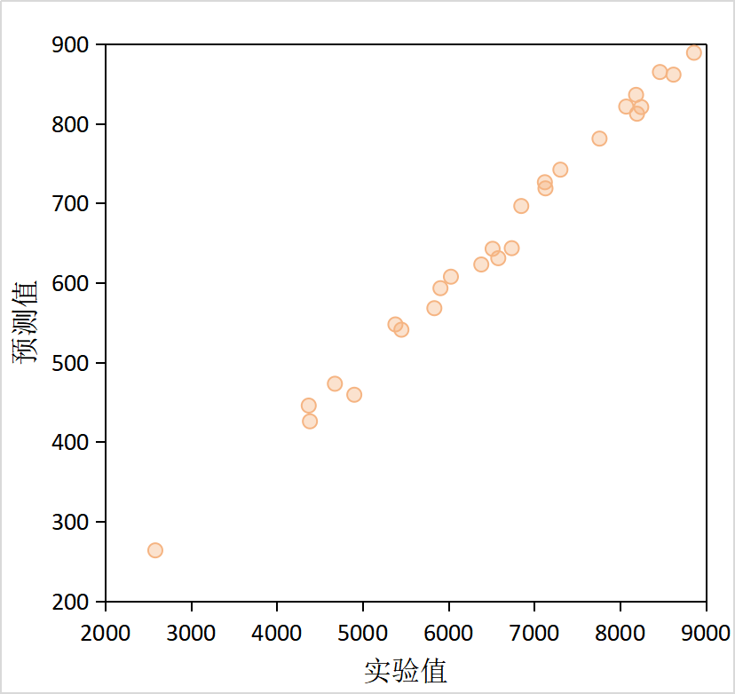 上圖為某類高分子材料聚合后數均分子量(線性相關系數為0.98)預測結果,即使對聚合體系進行了等比例縮小,預測值和實驗值仍然具有良好的線性相關性(數據已進行脫密處理)。