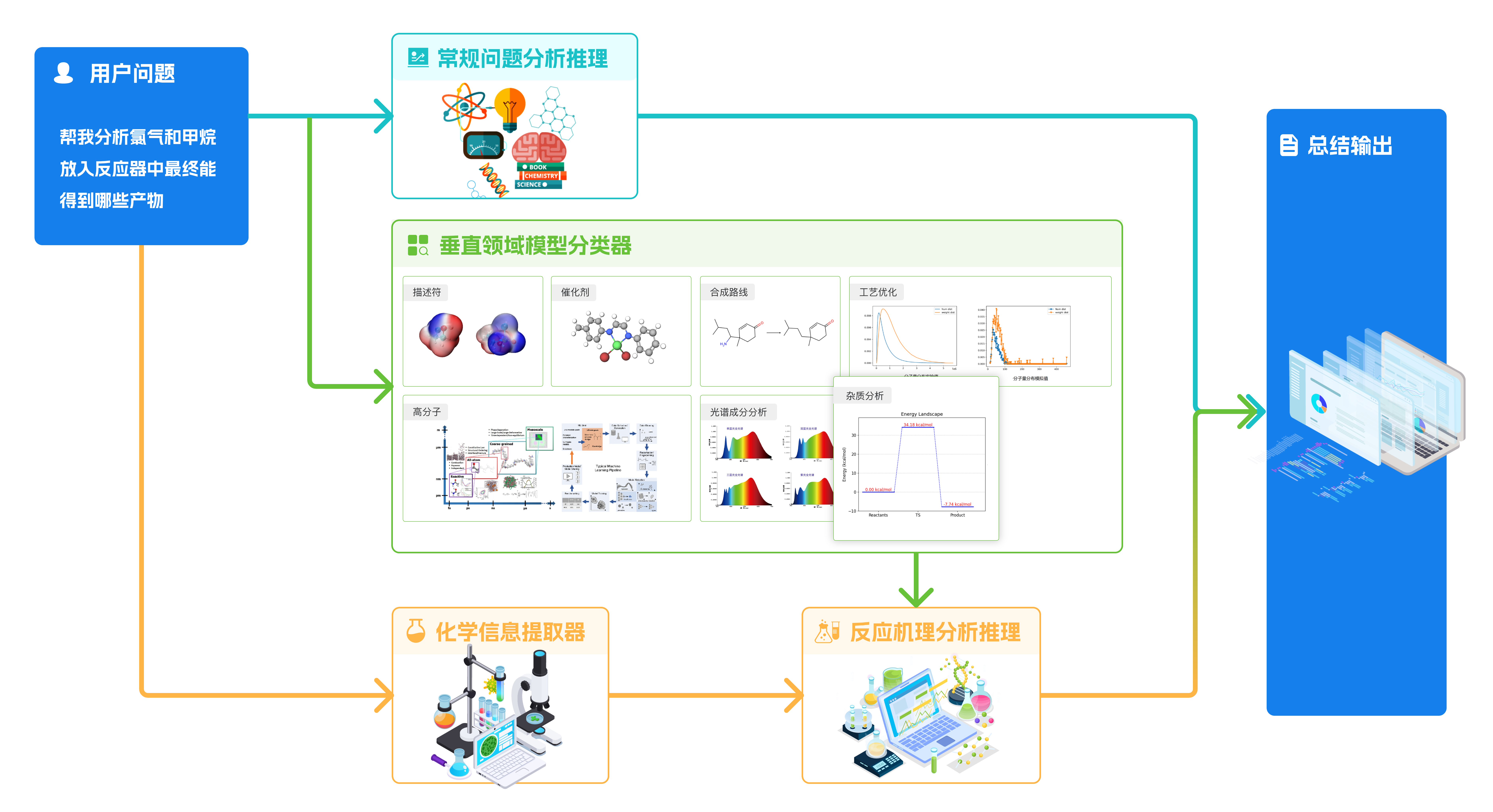 「國工化工大模型」改變了大模型的“文科生”設定,朝著“理科生”深度進化。大模型技術與國工智能AI for Science領域的垂直能力深度融合,針對具體問題進行識別后,聯(lián)動調用「合成推演」、「催化劑設計」、「分子動力學及計算化學描述符構效關系計算」、「構效關系計算」、「產物預測」、「量熱預測」、「實驗/工藝優(yōu)化」、「高分子配方與性能預測」、「譜圖逆分析」等15種垂直領域模型進行協(xié)同分析,真正實現(xiàn)大模型在化工場景的“深度思考”。